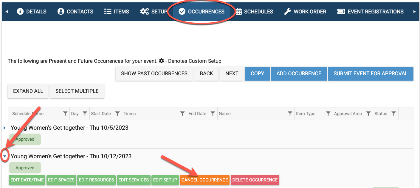 - Then navigate back to the Occurrences tab to adjust any occurrences such as canceling ones that fall on a holiday.