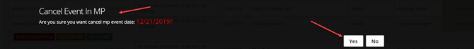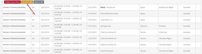 Next, you will have the option to cancel the occurrence in MinistryPlatform by selecting Cancel in MP.