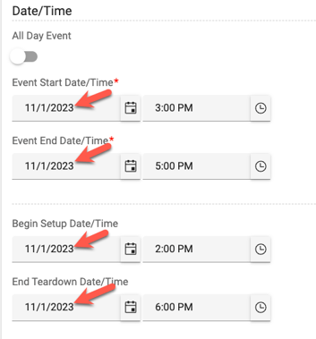 - Enter "Begin Setup Date/Time" and "End Teardown Date/Time" (based on Admin setting selections within Settings > Advanced > General > Event Creation.)