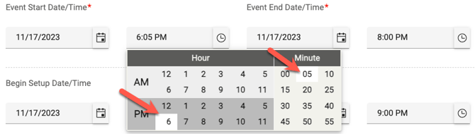 - If you started this process from a Calendar View, the event start time will already be pre-populated.
