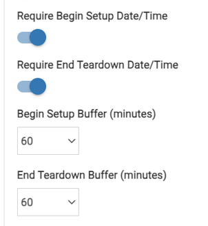 - If an Admin has made the Setup and/or Teardown Dates/Times required, the user will be required to add these. If a buffer has been added for either one, then these dates/times will automatically pre-populate (see settings below).