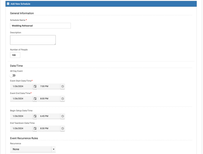- If "Number of People" are required under Settings > Advanced > General > Event Creation then read: Event Scheduler | Number of People Required when using Add New Schedule or Override