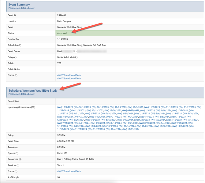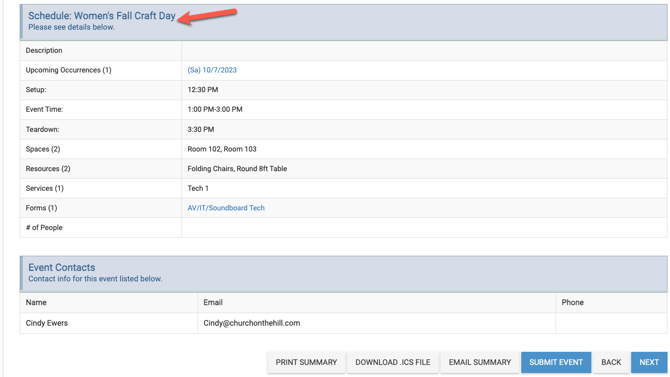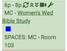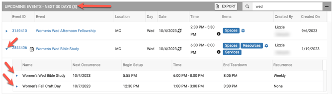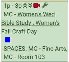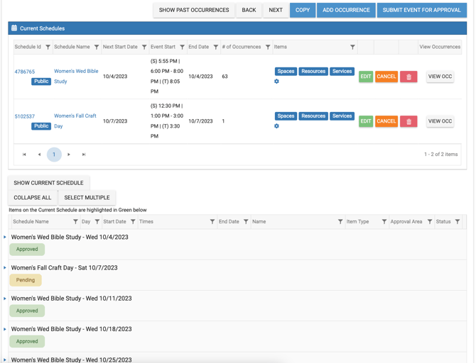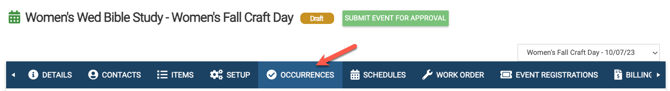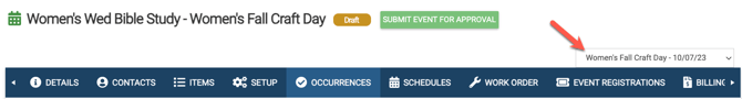 - In the example below the occurrences are all "Women's Wed Bible Study" and the schedule is "Women's Fall Craft Day". The schedule is also showing as being selected in the drop-down menu at the top right side.