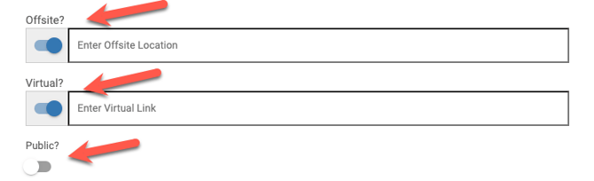 - While different schedules and occurrences on the event can be public vs. non-public or virtual vs. not-virtual, all schedules and occurrences on the event can only be either onsite or offsite.