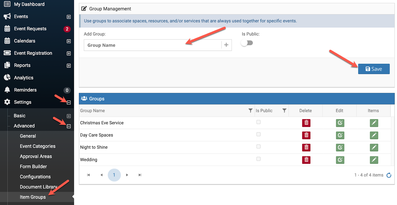 Admins have the ability to create item groups that can be used during the event creation process by all users.