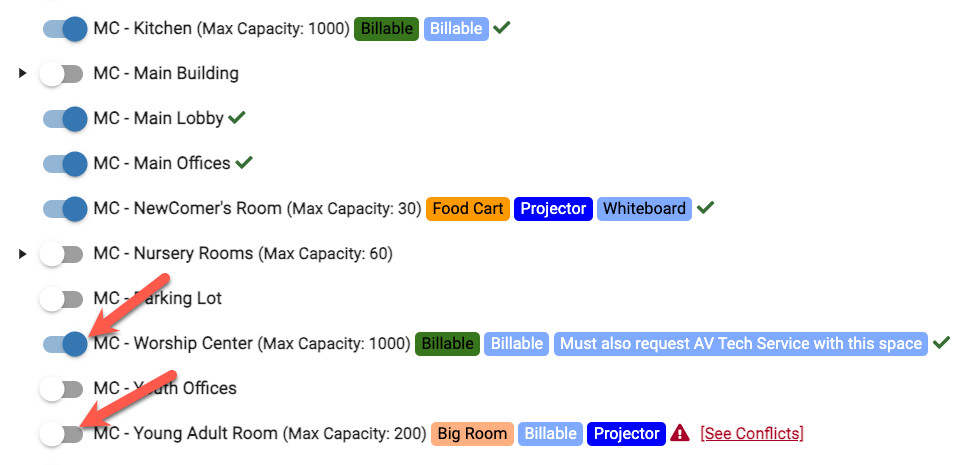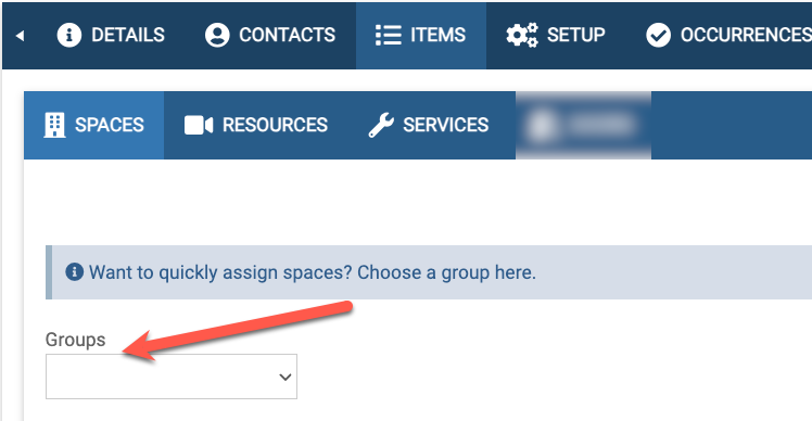 Once you get to the Spaces tab (as shown below), choose the Group name from the drop-down and all of your items (spaces, resources, and services) will be pre-populated for you, according to the group settings.