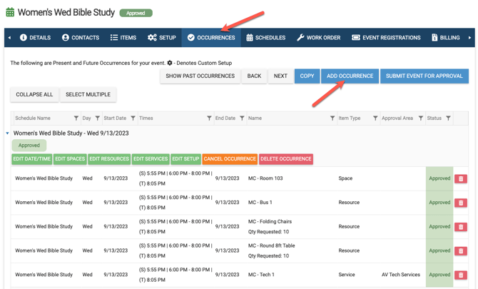 If you need to add an occurrence to an event in Event Scheduler, whether it is a one off or you just need to add another one, you can easily do so by going to the Occurrences tab of the event."