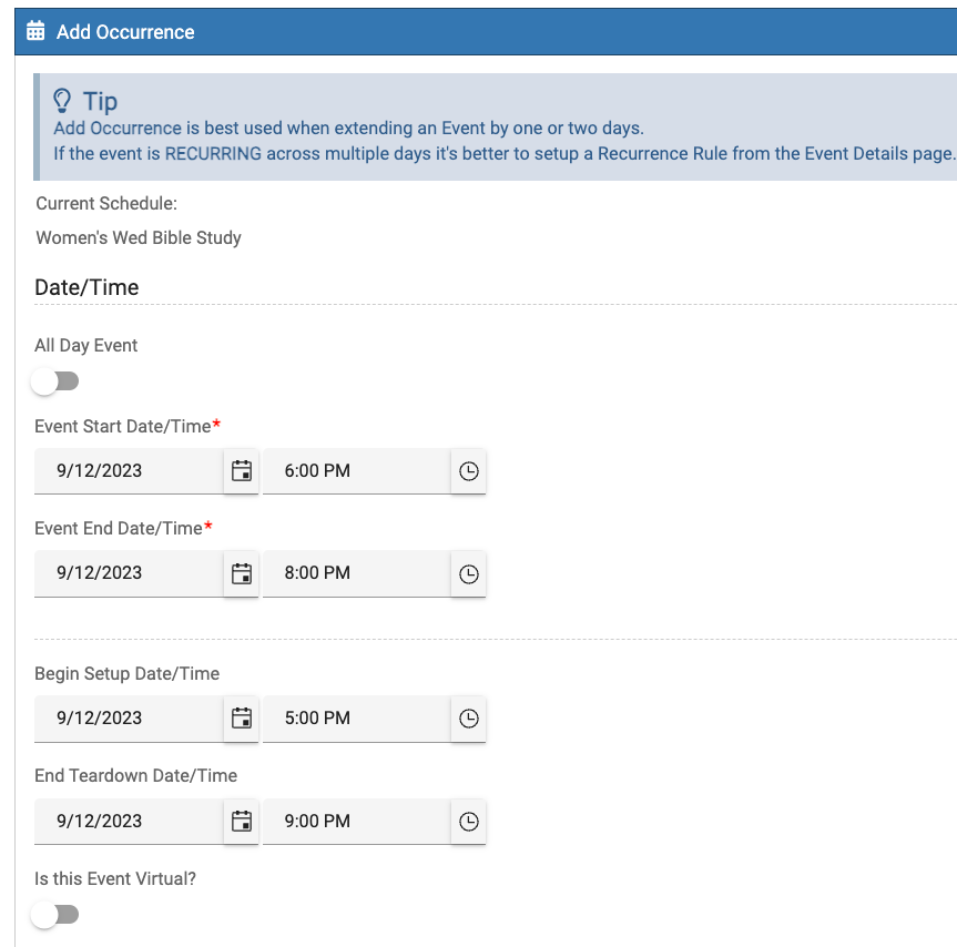 Then click on Add Occurrence, where you can add the additional Event Date and complete the form information.