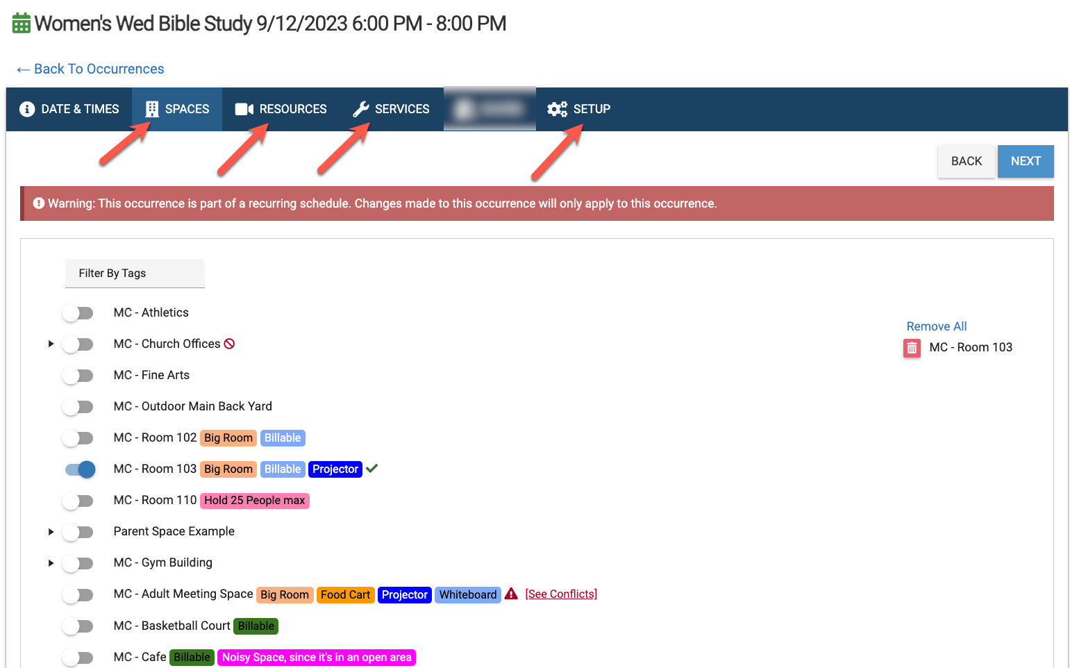 Continue with editing or keeping your Spaces, Resources, and Services associated with the occurrence.