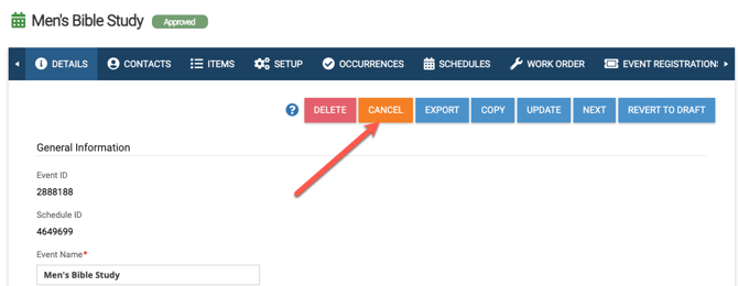• Go to the event "Details" page of the event and select the orange "Cancel" button (see below).