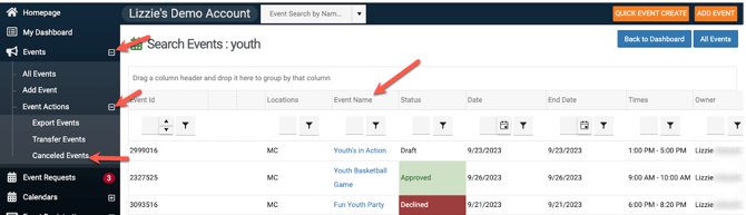 • The event will then be removed from your dashboard. To view the canceled event, go to Events, located on the left sidebar of your dashboard, then Event Actions and Canceled Events. You will see all of your canceled events here (see below).
