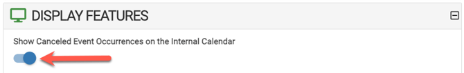 • Internal Calendar - By default, canceled event occurrence(s) are NOT displayed on the internal calendar. If you want all canceled event occurrence(s) to show on your calendar, an Admin must go to Settings>Advanced>General>Display Features, check the box for the setting shown below and SAVE.