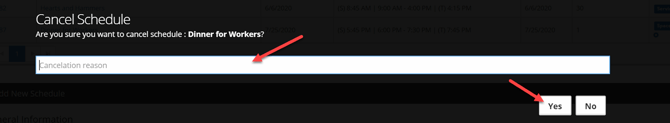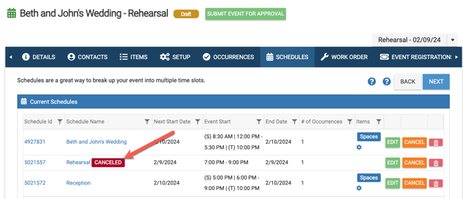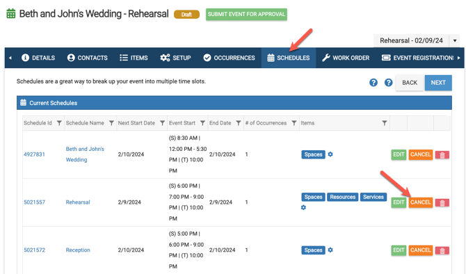 • To cancel a schedule, go to the Schedules tab of the event and select the Cancel button to the right of the desired schedule.