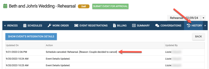 •  The event history will reflect the canceled schedule.