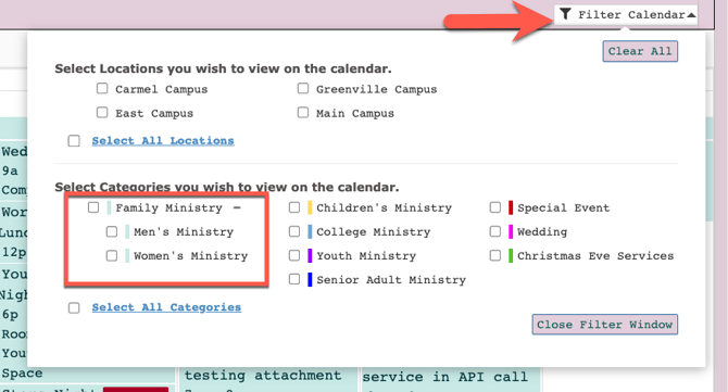 The event categories will also appear in the "parent" and "child" hierarchy in the filter option on the public calendar.