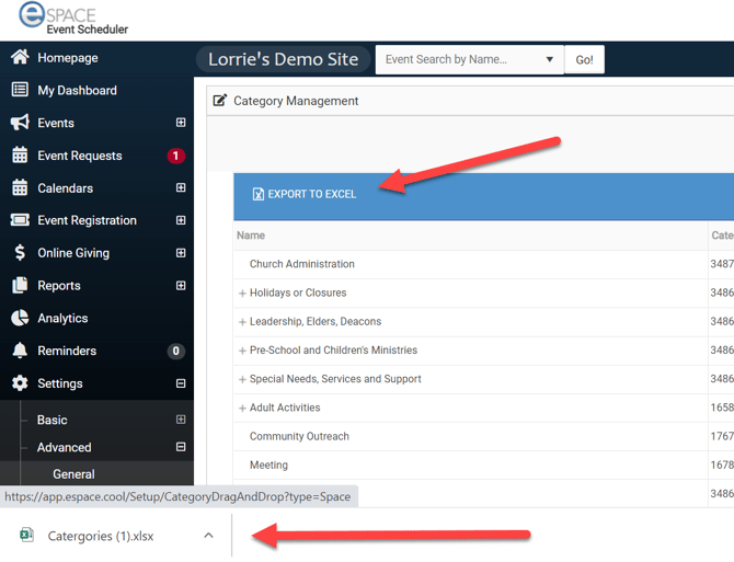 Click Export to Excel and a new Excel file of your Event Categories will be available