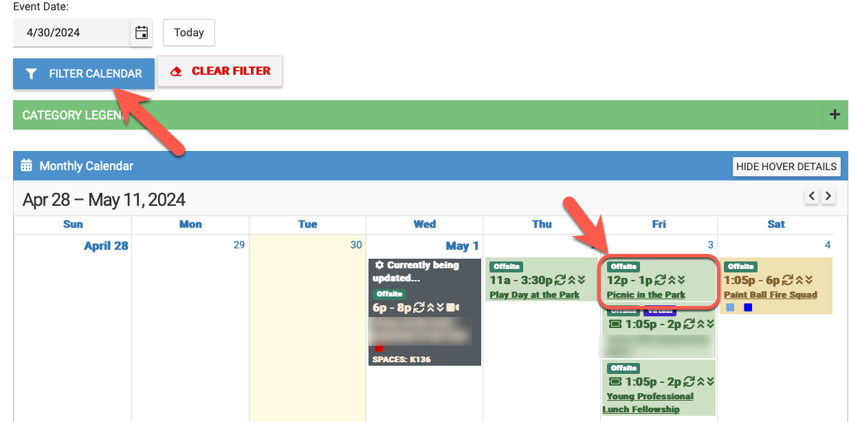 - All users will be able to filter events by "Offsite" on the internal calendar views.