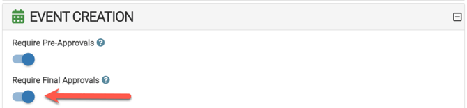 If you want to have an Admin(s) and/or Sub-Admin(s) take a final look at all of the submitted approved events and have them give a final approval, go to Settings > Advanced > General > Event Creation to enable the Final Approval process, as shown below.