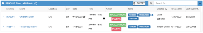 When selected and after all Sub-Admins and Admins have approved their areas of responsibility for an event, the Final Approver will be able to see the event on their dashboard (Final Approval grid) to approve or decline, based on their location permissions.