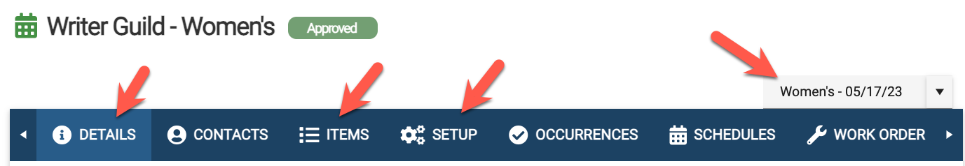 You can customize the names and descriptions of single occurrences within the same event! You can also customize the Setup tab, Items Tab, and Details tab in general and in a way where that the customized occurrence stands out on the event so that other users can easily see unique details for that occurrence. To do this, you must first separate that occurrence into its own schedule on the event by making it an overridden occurrence.