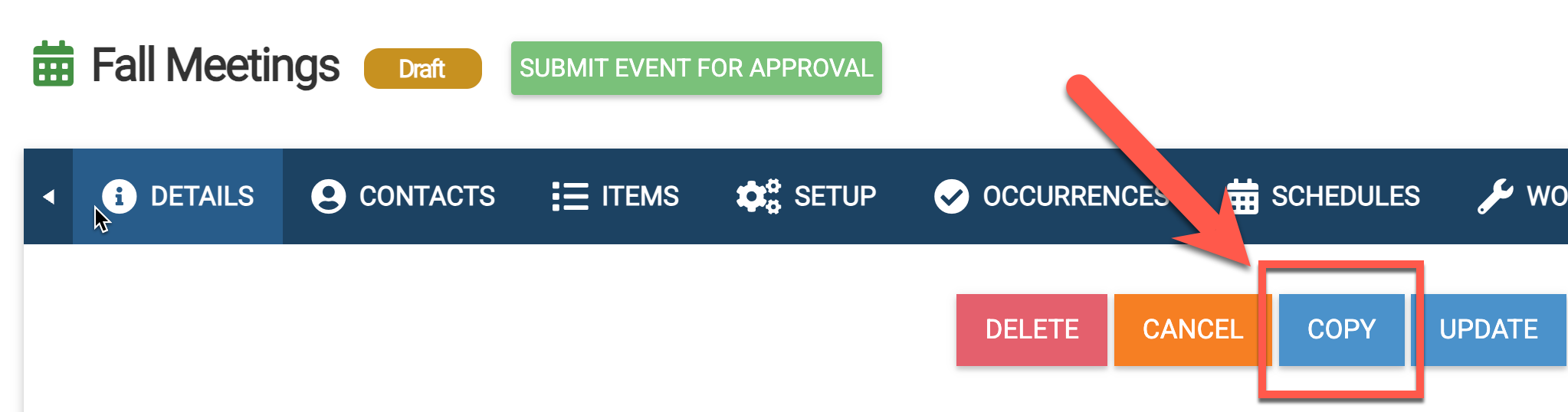 - The best way to do this would be to copy the original event, enter in the dates or date range that you need for the event to be offsite, and then go back to the original event and delete that one or many occurrences from the Occurrence tab.