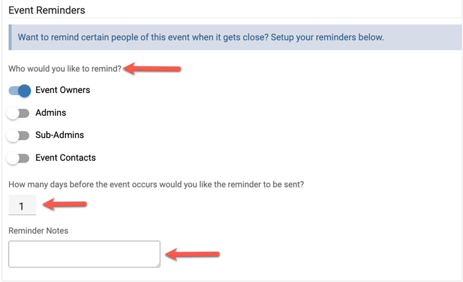 - If someone is the event owner and contact, admin and contact, or sub-admins and contact then they will see the notification about the event reminder in the left side menu bar and they will get an email notification about it. However, all admins, sub-admins, and event owners must also have the "Event Reminder" email notification enabled in their account in order to receive the email reminder as well.