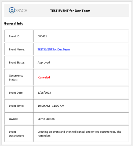 - In the event reminder email, event reminders will include the status of the event as well as the status of the specific occurrence when there are multiple occurrences within an event.