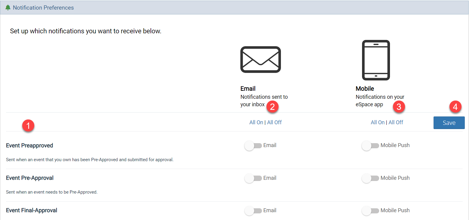 - Sub-admins notification preferences apply to all events that they are the creator/owner of. They will have notifications about events that are created with items in one of their approval areas that needs approving.