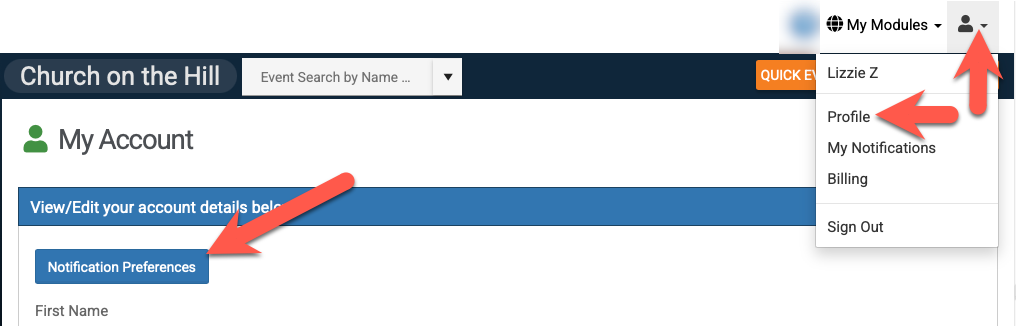 - To enable email notifications, go to the top right of your dashboard, click on the person icon drop-down menu, as shown below, select Profile and Notification Preferences.