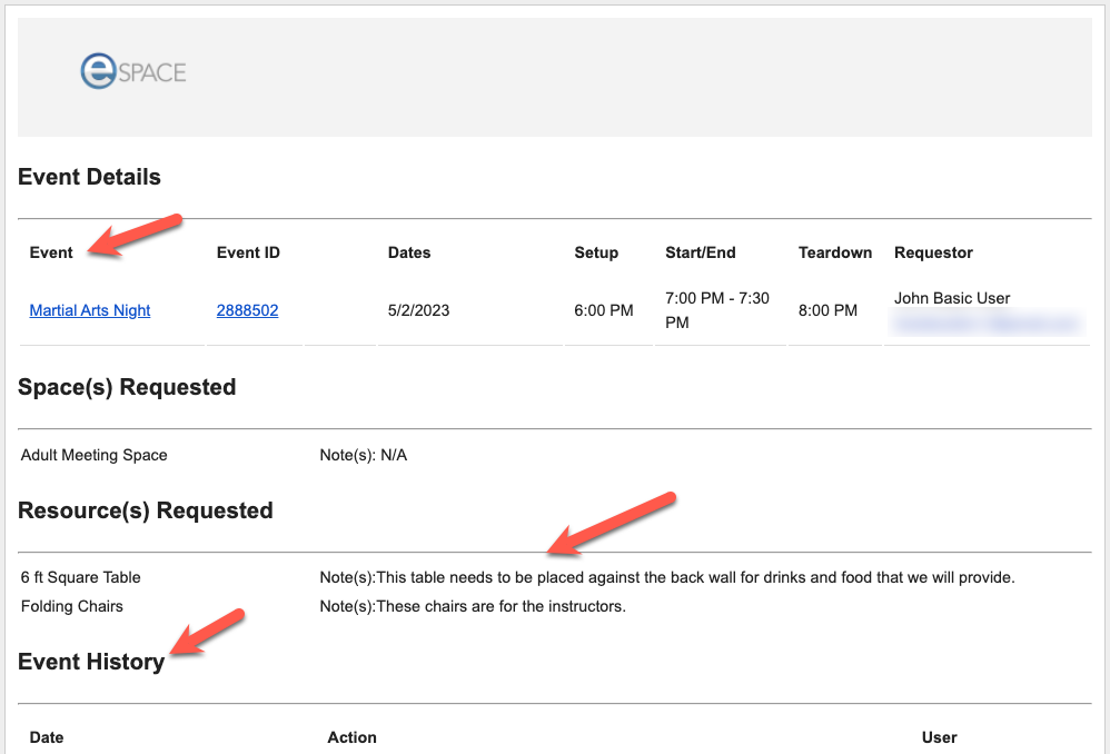 The email notification will include the Event Details, Item(s) Requested (Spaces, Resources, Services) and Event History (see below).