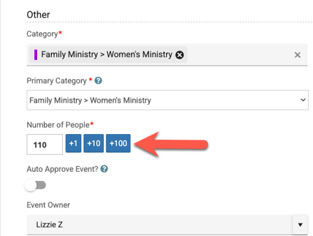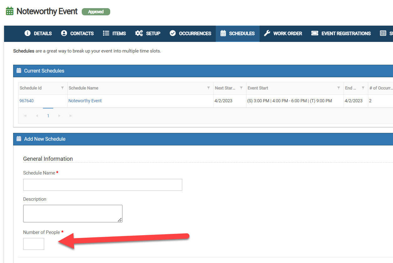 Once enabled, all users can add the number of people expected for their event on the main Details tab of each new event, as well as the new schedule or occurrence they add to an existing event.