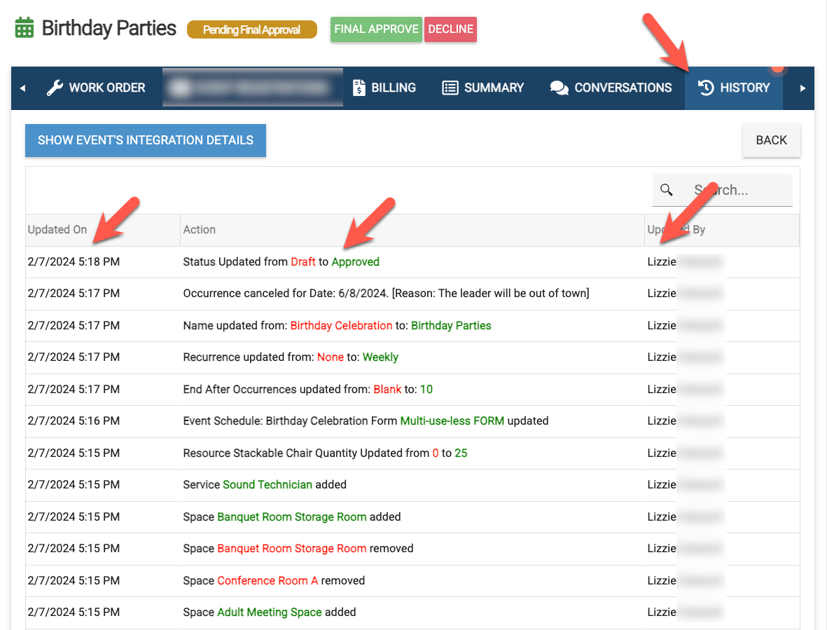 On the History tab, all users can view the log of edits made to the event, see which user made them, and when!