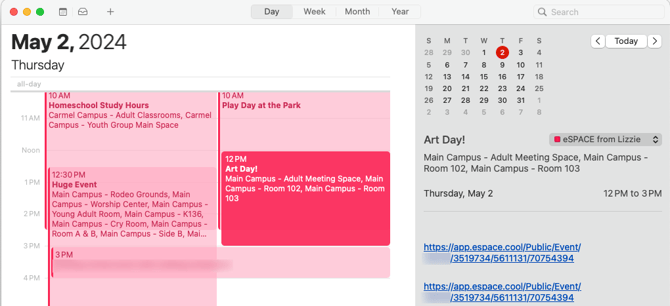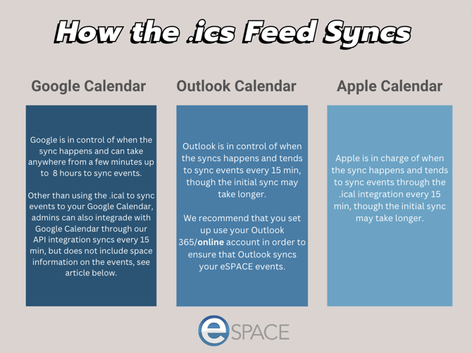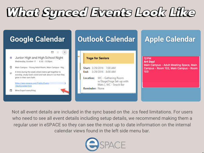 Google, Outlook, and Apple allow outside calendars to be synced by an .ics file (called iCal in the Apple world) so we have created a way for your eSPACE events to export in an .ics file so you can view eSPACE events on those calendars! Since Google, Outlook, and Apple only sync over basic event details, you won't see all event details such as set up notes on the events on your Google, Outlook, or Apple Calendar. The sync is designed to include the past 30 days of events along with future events.