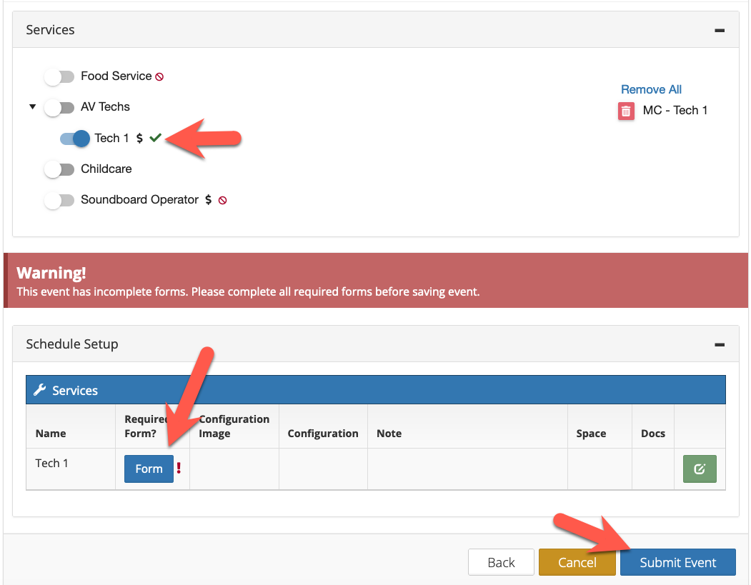 Once those three things are done, when an external person fills out an Event Request Form and toggles on spaces, resources, and/or service that also has an internal form attached to it, they will see the option to fill out that internal form. Once filled out, they can submit the event request.