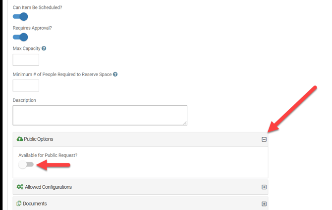 - Learn more in this article: Adding & Modifying Spaces/Resources/Services in eSPACE - See section called "Public Options".