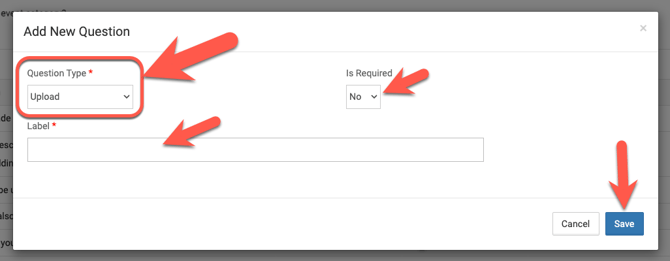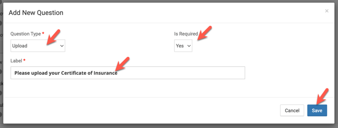 - If you also have Billing & Invoicing on your subscription and have decided to make this a billable form and you want the external user to be able to upload an attachment when they fill out the event request (like a certificate of insurance) then add the question type "Upload" and add in the "Label" something like "Please Upload Your Certificate of Insurance" and marked the question as required.