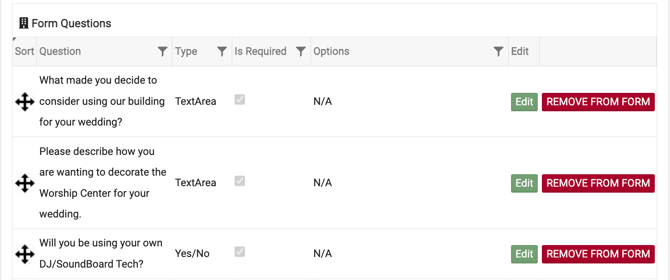 Add as many custom questions/fields as you like, and you can even change the order if you wish by clicking, holding, dragging, and dropping them in the sort column.