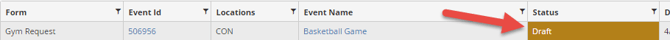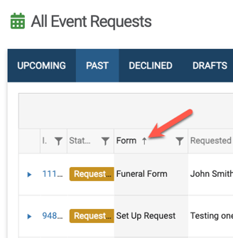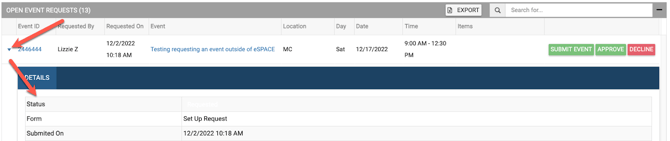 Either in the Event Requests or on the Dashboard, the admin(s) and/or Sub-admin(s) assigned to manage the Event Request Form(s) can click on the arrow to the left of the ID to view the event request form.