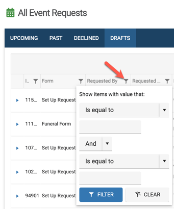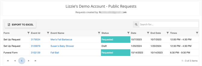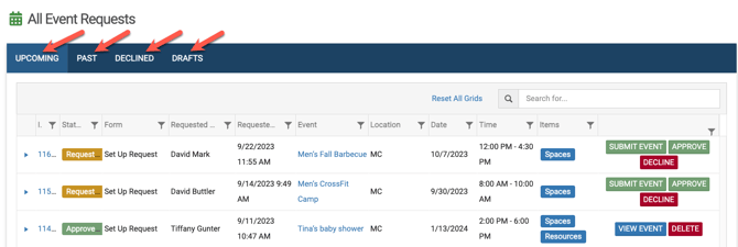 Within the "All Event Requests" grid, you can view upcoming, past, declined and draft public event requests as shown below. You also have the ability to search for an event request.