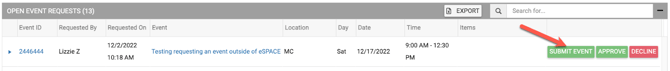 - If regular users and sub-admins are made the manager of an event request form, this gives them the power to approve and bypass the regular approval flow you have set up by clicking "Approve" on the event when it's in their "Open Event Request" grid on their dashboard. They can also choose to "Submit Event" to the regular approval flow that you have set up in your eSPACE account instead.