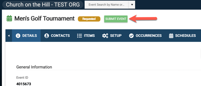 - Once you review the event request, you can submit it for the regular approval flow by clicking "Submit Event" next to the title.