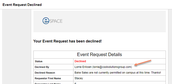 If the form manager chooses to "Decline" the event, there will be a screen that pops up where you can enter the reason for the decline and an email notification will be sent to the requester that includes who declined it and why (see below).