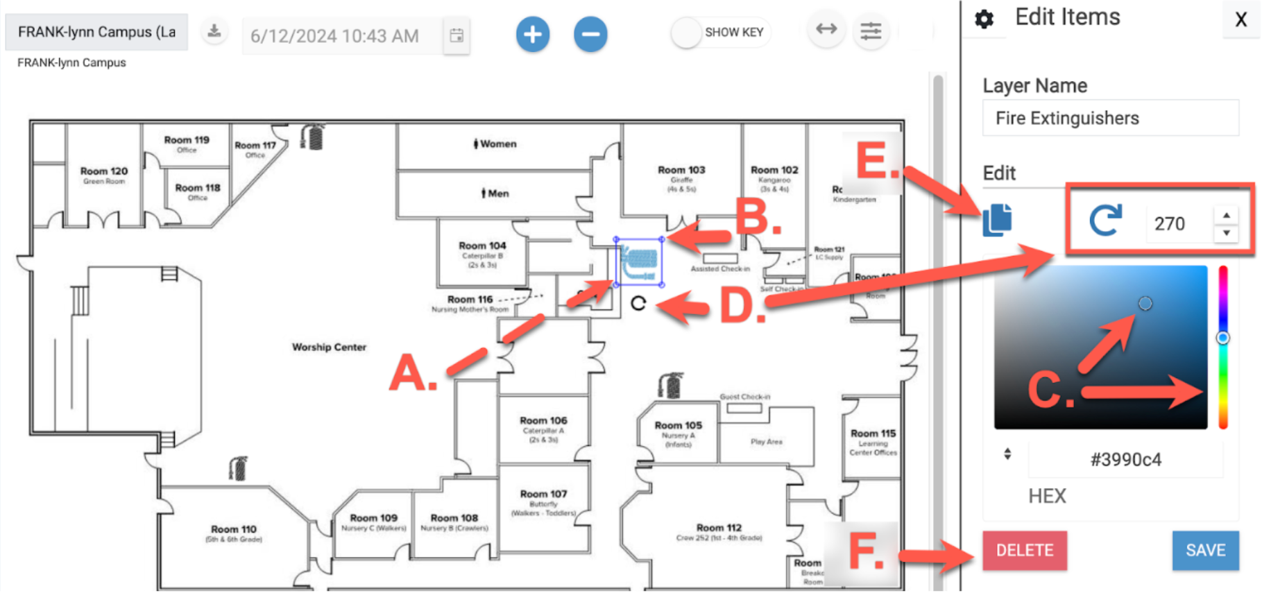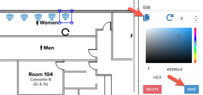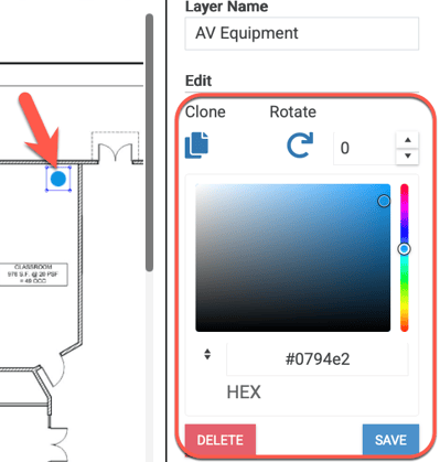 6. Whether you choose to add a custom text, generic shape, or one of the default equipment icons, once it's added to the floor plan you will have the following options: