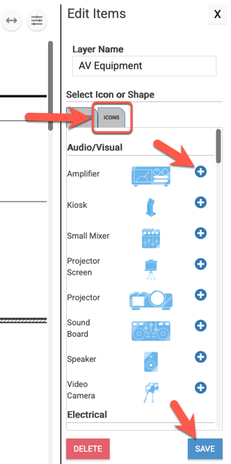 5. On the Icons tab you can scroll through the list of default equipment icons and then click the plus symbol next to one in order to add it to the floor plan.