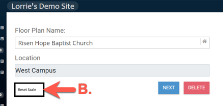 If you need to reset the scale for your Floor Plan, then A. click the edit icon to the far right of the Floor Plan name and then choose "Reset Scale".