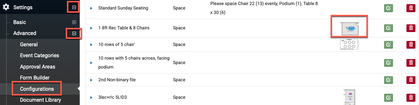 The Configurations feature under Settings allows admins to name, describe, and add a picture of a setup configuration and then assign that configuration to as many spaces as needed. When a user is adding an event request to Event Scheduler, they can choose the space needed on the Items > Space tab and then on the Setup tab can select edit next to the space to select an available configuration. Also, when you export the "Event Setup" report (& choose to include attachments) it will show the name, description, and picture of the configuration selected for the space within that event.