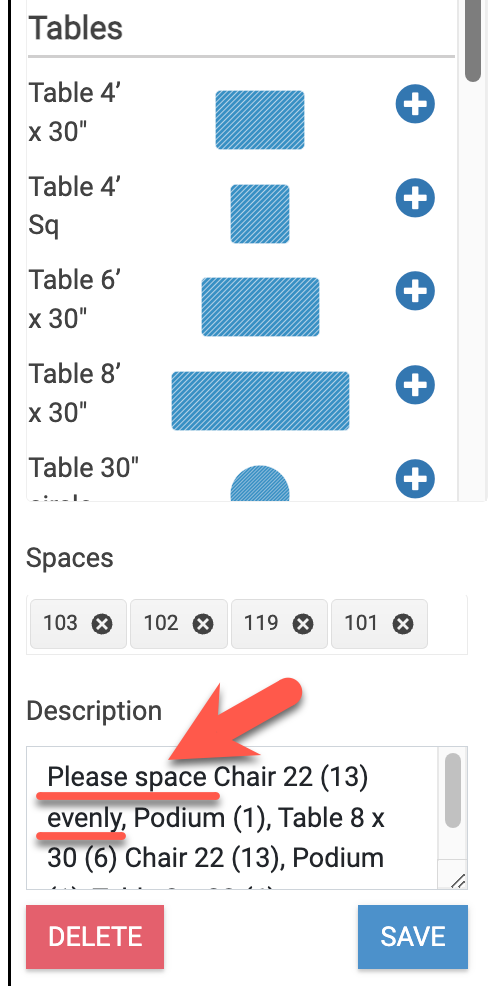 Users with editable access to Floor Plan can also add to the description that gets automatically generated based on what shapes are added if desired.