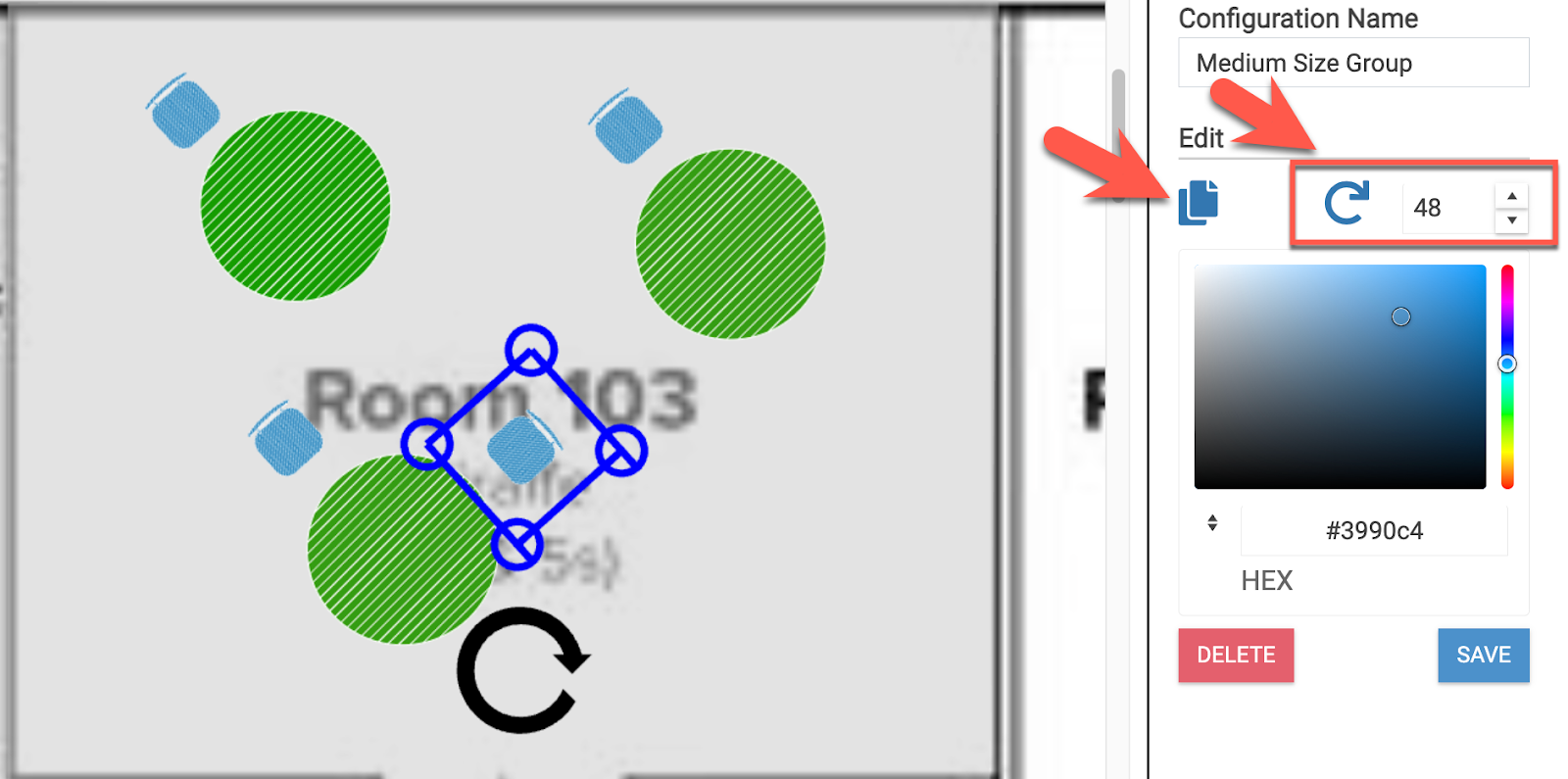 - E. Cloning: You can clone the icon or shape you are currently working with in order to quickly add several of the same icon, such as a rows of chairs. (You cannot select a grouping to clone at this time)