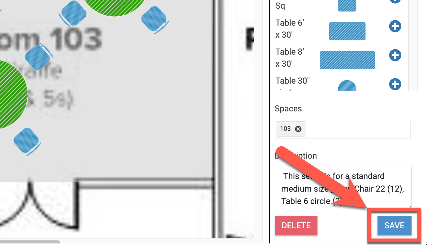 Keep in mind that Space Configurations created on Floor Plan automatically adjust to the scale of the space (unless you are using only "Shapes"). Therefore, each Space Configuration is specifically designed for the space in which it is initially created in. However, you can add additional spaces to a Space Configuration which is helpful for buildings with multiple spaces that are in similar size and need the same Space Configuration.