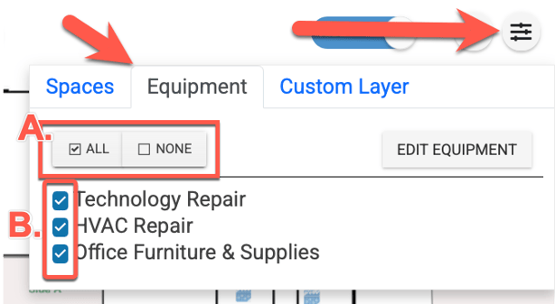 Once you have equipment in different service categories linked to their location on the floor plan, then you can choose to enable or disable those different layers by checking or unchecking them. Click the menu option at the top right, choose the Equipment tab, and then either A. check the "All" or "None" option or B. select individual Service Categories.